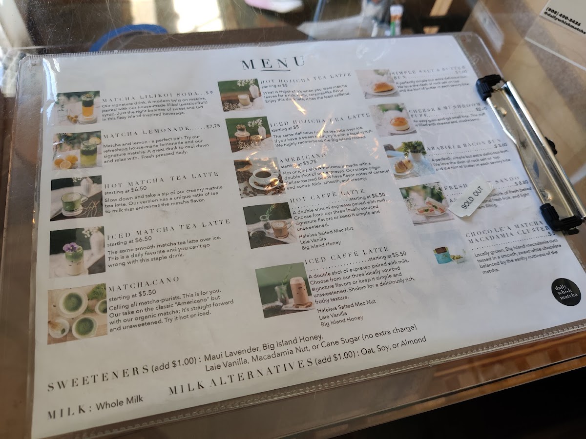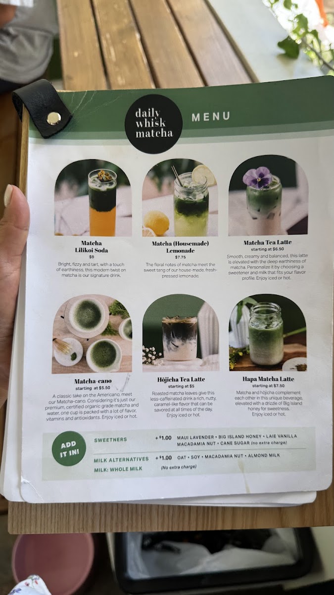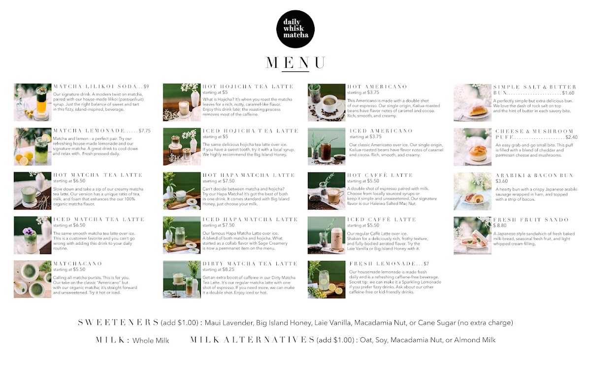 From my visit to Daily Whisk Matcha, the menu feels like a focused celebration of matcha crafted with creativity and island flair. Refreshingly different from your typical tea house, highlights include the Matcha Lilikoi Soda ($9), a fizzy, tangy‑sweet fusion that perfectly balances vibrant matcha with house‑made passion fruit syrup - a drink that practically defines what this café does best. Alongside that, their Matcha (Housemade) Lemonade offers a cool, citrusy take on green tea that’s ideal on warm Honolulu afternoons, and the creamy Matcha Tea Latte delivers a smooth, milky sweetness that’s well suited to both matcha newcomers and purists alike. Reviewers also rave about the Matcha‑Cano, a purer, Americano‑style matcha for those who want bold flavor without added sweetness, and the Hōjicha Tea Latte, whose nutty, roasted notes contrast nicely with the brighter matcha options.